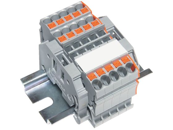 スプリング式端子台で省工数、省スペース、緩みなくメンテナンス不要、プッシュボタン付きで結線作業が容易です。単線およびフェルール付より線は、電線を差し込むだけで結線可能です。DINレールに端子台と必要なアクセサリを組み立て済みなので、すぐに使用できます。 |