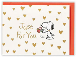 箔押しのハートがちりばめられたスヌーピーの多目的カード。