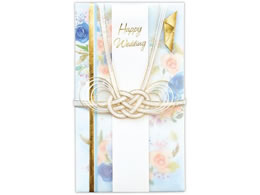 爽やかなブルーと白いバラのデザイン。「寿」と「御結婚御祝」の短冊付き。