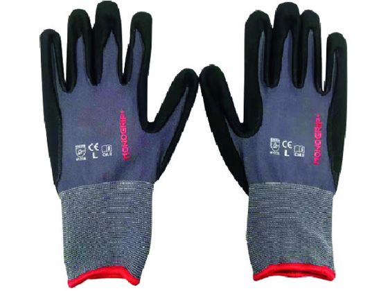 ●色:グレー●サイズ:L●ゲージ数:15●全長(cm):24.5●手のひら周り(cm):19.0●中指長さ(cm):8.0●厚さ(mm):1.5●リストカラー:レッド●15ゲージ編●ナイロン、スパンデックス●手のひら:ニトリルゴム、水性PU