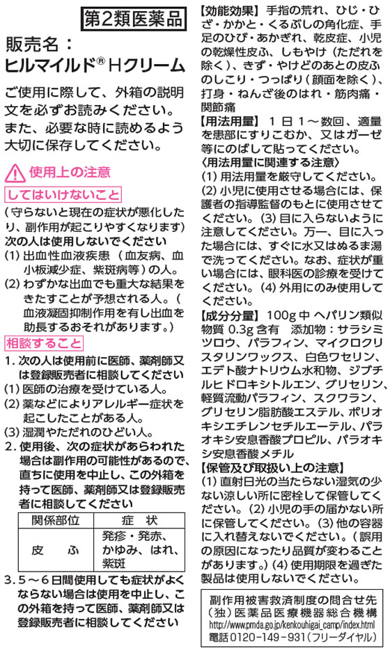 手指の荒れ、ひじ・ひざ・かかと・くるぶしの角化症、手足のひび・あかぎれ、乾皮症、小児の乾燥性皮ふ、しもやけ(ただれを除く)、きず・やけどのあとの皮ふのしこり・つっぱり(顔面を除く)、打身・ねんざ後のはれ・筋肉痛・関節痛
