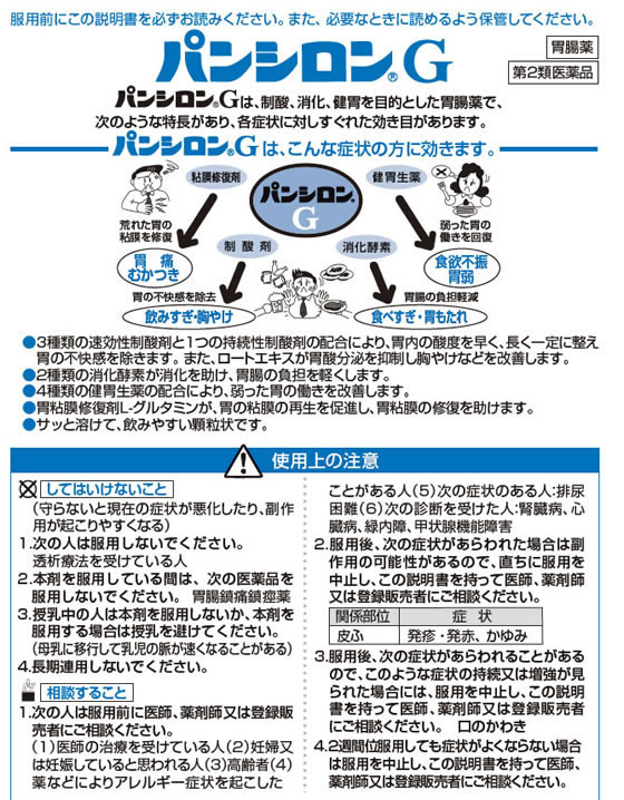 パンシロンGは、速攻性と持続性制酸剤の配合により、胃痛・胸やけといった過酸による症状にすぐれた効果を発揮します。又、タンパク分解酵素、でんぷん分解酵素の働きにより、消化力を高め、胃の負担を軽くスッキリとさせます。更に、健胃生薬が弱った胃の働きを回復させ、胃粘膜修復剤 L−グルタミンが飲みすぎで荒れた胃を修復します。