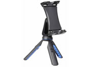 タブレットホルダーの角度調整、縦位置、横位置とわずかに上方向に向きの調整が可能。 脚の伸縮:脚裏側のレバー操作により、5段階で伸縮できます。 三脚部分とタブレットホルダー部分は着脱可能。ホルダーを他の三脚に取り付けることもできます。 タブレットホルダー上部にアクセサリーネジ付きで、市販のライト類の固定が可能です。 |