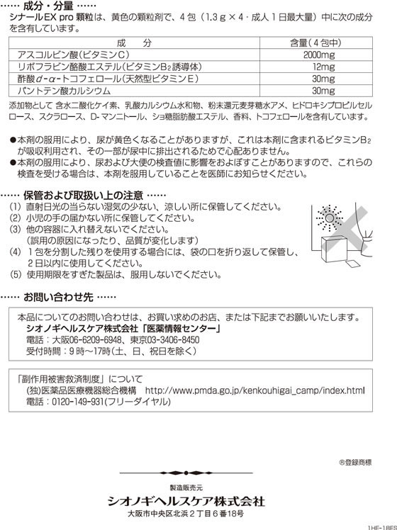 人は、体の中でビタミンCをつくることができないため、毎日摂取することが大切です。シナールEX pro 顆粒は、ビタミンCの補給に適したビタミン剤で、口の中でさっと溶けるのみやすい顆粒です。またビタミンCとともに抗酸化作用をもつ天然型ビタミンE、皮ふの正常なはたらきをサポートするパントテン酸カルシウム、肌のすこやかなはたらきをサポートするビタミンB2を配合しています。