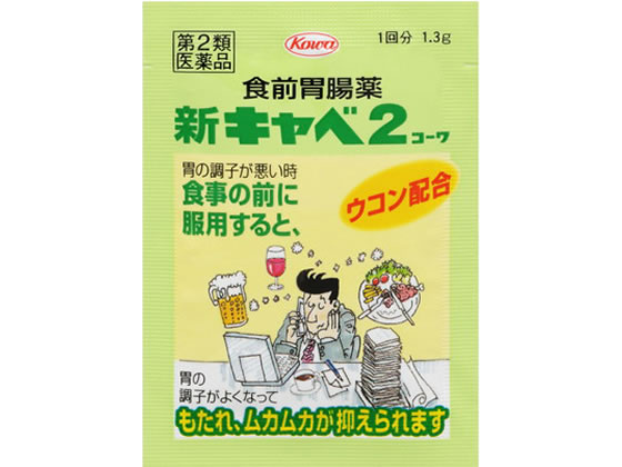 新キャベ2コーワは、この目的に沿って開発された食前タイプの胃腸薬で、胃の調子が悪い時、食事の前にのみますと、弱っている胃の壁に保護膜をつくりながら事前に胃の働きをよくしておいてくれます。もたれ、ムカムカが抑えられ、また胃がスッキリしますので、食欲が出て食べられるようになります。