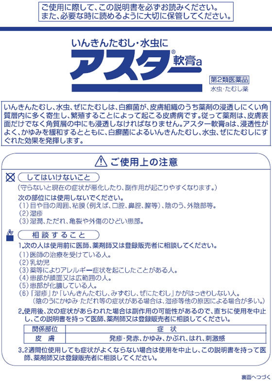 いんきんたむし、水虫、ぜにたむしは、白癬菌が、皮膚組織のうち薬剤の浸透しにくい角質層内に多く寄生し、繁殖することによって起こる皮膚病です。従って薬剤は、皮膚表面だけでなく角質層の中にも浸透しなければなりません。アスター軟膏aは、浸透性がよく、かゆみを緩和するとともに、白癬菌によるいんきんたむし、水虫、ぜにたむしにすぐれた効果を発揮します。