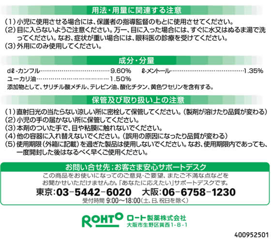 2.特に、カンフル、メントール、ユーカリ油は局所刺激作用および浸透力により、しもやけ、かゆみの症状を軽減し、不快感を除きます。