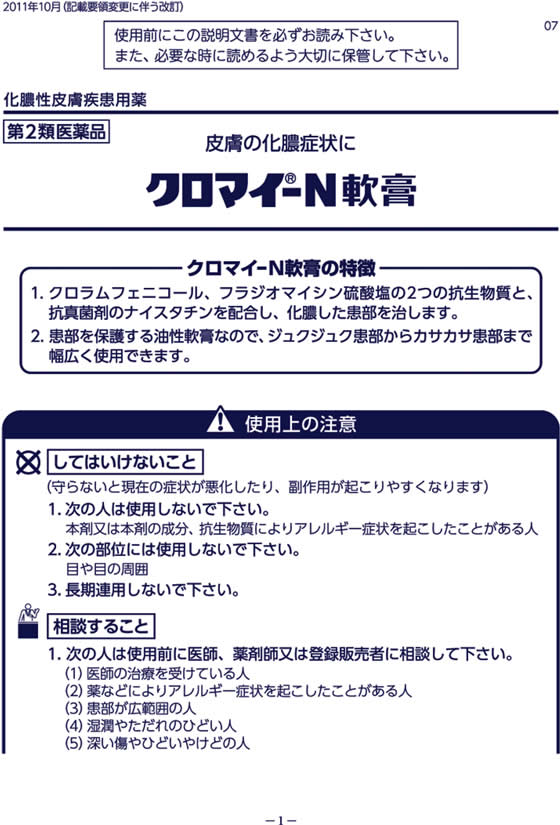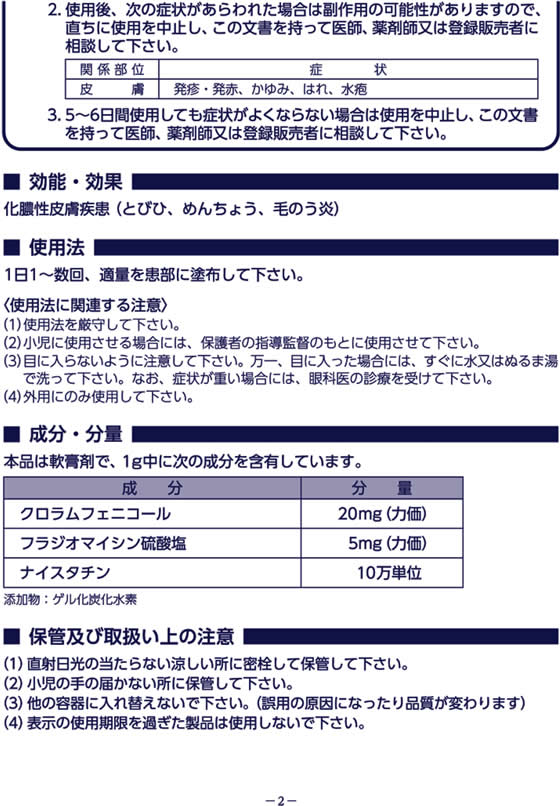 1.クロラムフェニコール、フラジオマイシン硫酸塩の2つの抗生物質と、抗真菌剤のナイスタチンを配合し、化膿した患部を治します。