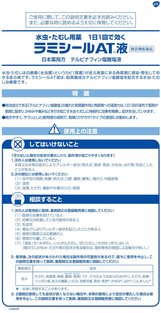 ●有効成分である塩酸テルビナフィンの優れた殺真菌作用と角質層への浸透力は、1日1回の塗布で薬剤が患部に留まり、かゆみや痛み等を引き起こす水虫・たむしに持続的に効果を発揮し、症状を治していきます。