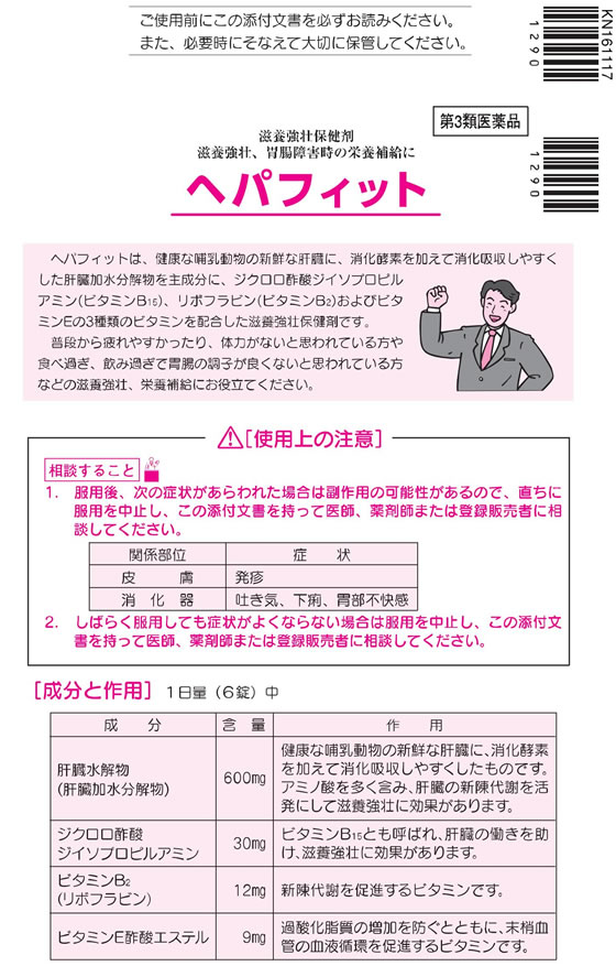 ●ヘパフィットは、健康な哺乳動物の新鮮な肝臓に、消化酵素を加えて消化吸収しやすくした肝臓加水分解物を主成分に、ビタミンB15、ビタミンB2およびビタミンEの3種類のビタミンを配合した滋養強壮保健剤です。