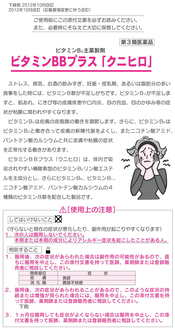 ビタミンBBプラス「クニヒロ」は、体内で吸収されやすい補酵素型のビタミンB2リン酸エステルを主成分とし、さらにビタミンB6、ビタミンB1、ニコチン酸アミド、パントテン酸カルシウムの4種類のビタミンB群を配合した製品です。