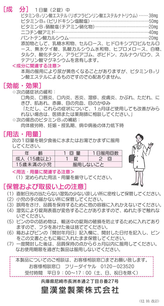 ○次の諸症状の緩和:口角炎、口唇炎、口内炎、舌炎、湿疹、皮膚炎、かぶれ、ただれ、にきび、肌あれ、赤鼻、目の充血、目のかゆみ「ただし、これらの症状について、1ヵ月ほど使用しても改善がみられない場合は、医師または薬剤師に相談してください。」○次の場合のビタミンB2の補給:肉体疲労時、妊娠・授乳期、病中病後の体力低下時