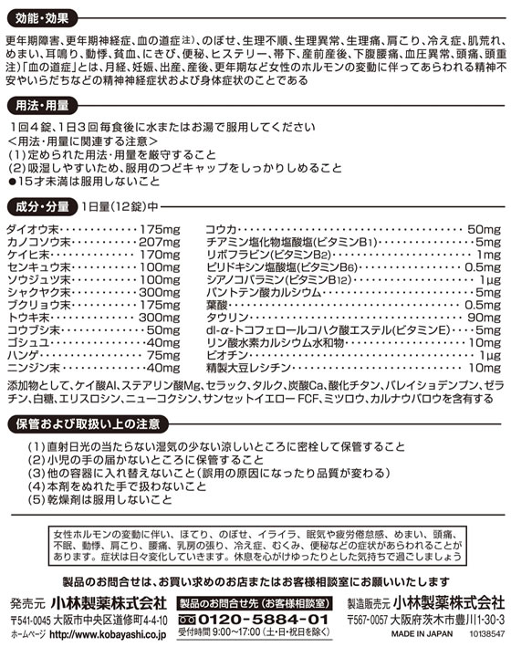 更年期障害、更年期神経症、血の道症−注)、のぼせ、生理不順、生理異常、生理痛、肩こり、冷え症、肌荒れ、めまい、耳鳴り、動悸、貧血、にきび、便秘、ヒステリー、帯下、産前産後、下腹腰痛、血圧異常、頭痛、頭重