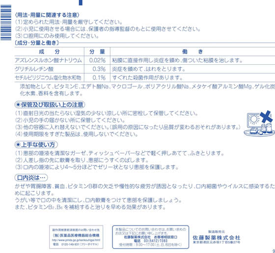 炎症を抑えるアズレンスルホン酸ナトリウム、グリチルレチン酸と、すぐれた殺菌力を持つ塩化セチルピリジニウムを配合した口内炎、舌炎用の軟膏です。