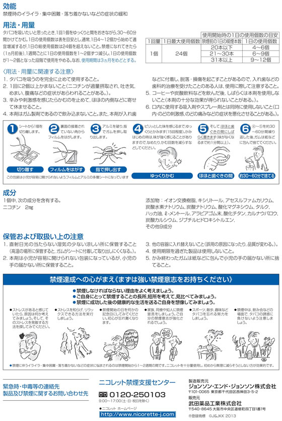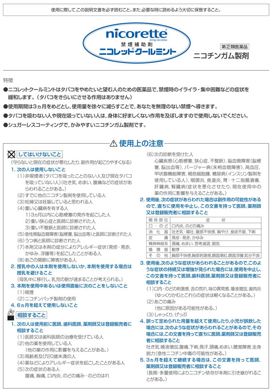●ニコレットクールミントはタバコをやめたいと望む人のための医薬品で、禁煙時のイライラ・集中困難などの症状を緩和します。(タバコをきらいにさせる作用はありません)●使用期間は3ヵ月をめどとし、使用量を徐々に減らすことで、あなたを無理のない禁煙へ導きます。