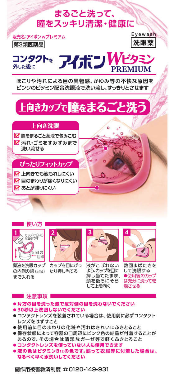 アイボンWビタミンPREMIUMは、3種類のビタミンとアミノ酸類を配合したピンクの薬液で、目にたまった汚れやほこりを洗い流し、瞳を健康に保ちます