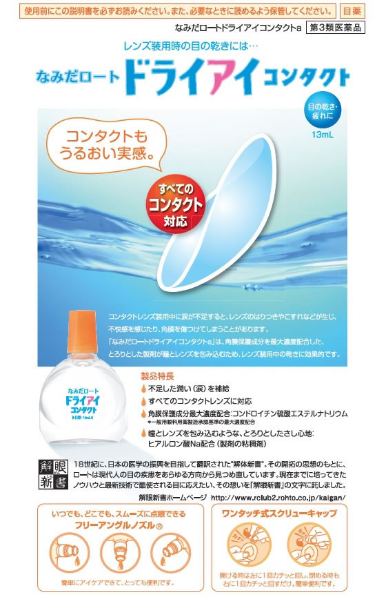 涙液の補助(目のかわき)、目の疲れ、目のかすみ(目やにの多いときなど)、ソフトコンタクトレンズ又はハードコンタクトレンズを装着しているときの不快感