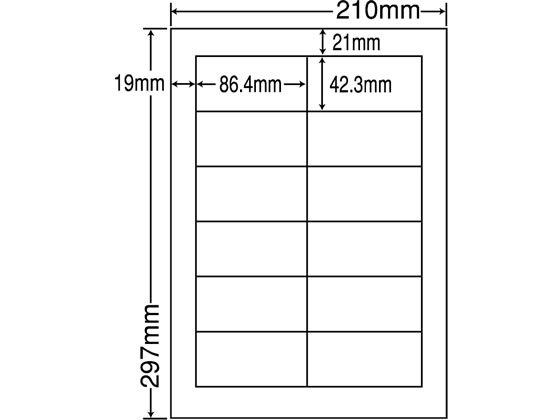 ●仕様:12面●シートサイズ:A4(210×297mm)●ラベルサイズ(横×縦):86.4×42.3mm●材質:古紙配合率100%の再生紙●標準総厚み:181μ(ミクロン)±5以内●ラベル厚:89μ(ミクロン)●白色度:67%(ISO)●対応プリンタ:インクジェット(染料のみ)、モノクロレーザー、モノクロコピー、熱転写●注文単位:1箱(100枚×5冊)●グリーン購入法適合●GPNエコ商品ねっと掲載