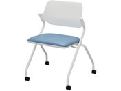 脚部と背はホワイトです。座面を折りたたんだ状態で並行にスタッキングできます。肘無しで立ち座りがしやすいデザイン。座面はPVC張りです。スタックピッチは120ミリメートル。 |
