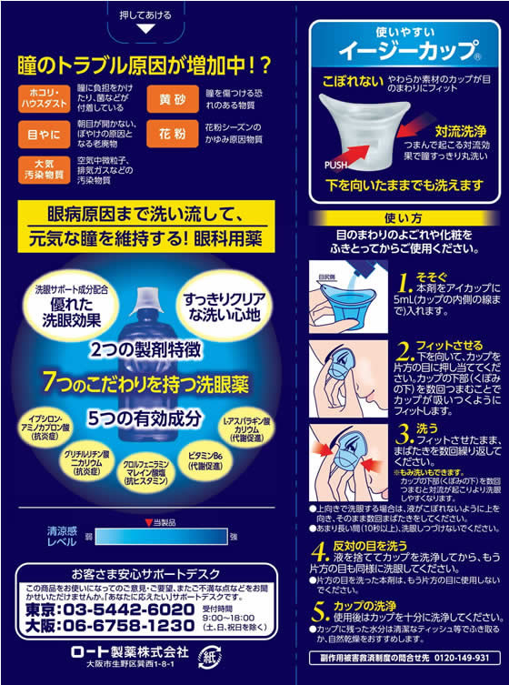 ロート製薬独自の「イージーカップ」を採用。上向き、下向き、どちらでも使用でき、つまんで起こる対流効果で瞳をすっきり洗浄します。