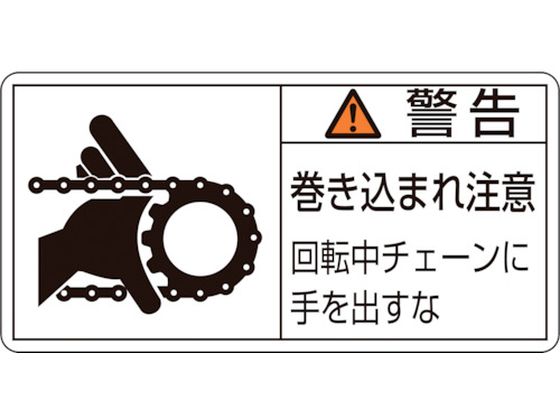 ●型番:203129 ●入数:10枚 ●表示内容:警告・巻き込まれ注意・回転中チェーンに手を出すな ●取付仕様:粘着シール ●縦(mm):35 ●横(mm):70 ●厚さ(mm):0.09 ●取付方法:貼付タイプ ●セット商品:10枚1組 ●基材:PET ●粘着剤:アクリル系