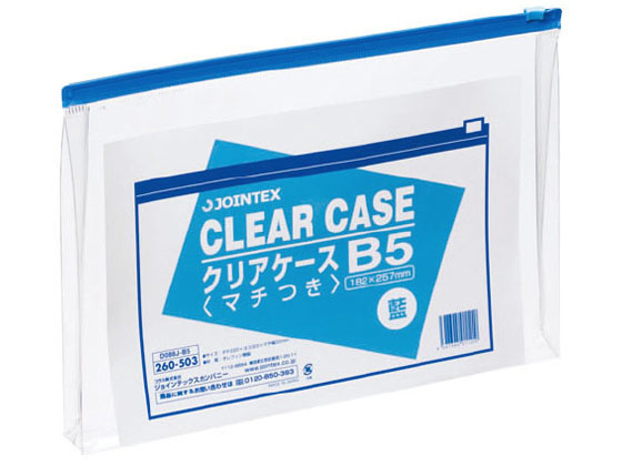 ●クリアケース●見出しなし●規格:B5−S●外形寸法:縦220×横305mm●内形寸法:縦200×横285mm●色:青●種別:マチ付●材質:オレフィン●厚:0.3mm●マチ幅:30mm●収容枚数:コピー用紙200枚●JOINTEXオリジナル