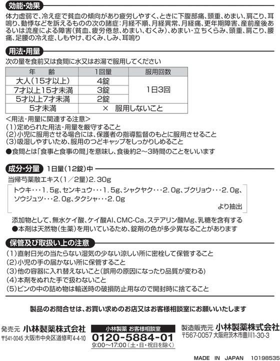 体力虚弱で、冷え症で貧血の傾向があり疲労しやすく、ときに下腹部痛、頭痛、めまい、肩こり、耳鳴り、動悸などを訴えるものの次の諸症:月経不順、月経異常、月経痛、更年期障害、産前産後あるいは流産による障害(貧血、疲労倦怠、めまい、むくみ)、めまい・立ちくらみ、頭重、肩こり、腰痛、足腰の冷え症、しもやけ、むくみ、しみ、耳鳴り