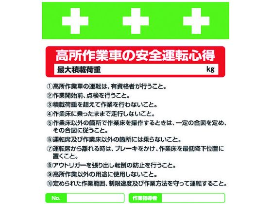 ●型番:T-034 ●表示内容:高所作業者の安全運転心得 ●取付仕様:マジックテープ ●縦(mm):600 ●横(mm):450 ●取付方法:マジックテープ ●ターポリン