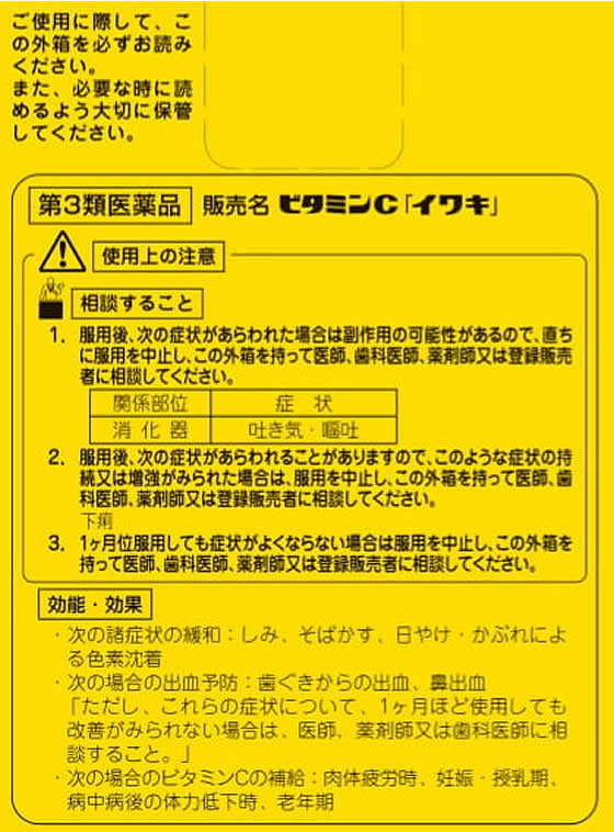 次の場合のビタミンCの補給:肉体疲労時、妊娠・授乳期、病中病後の体力低下時、老年期