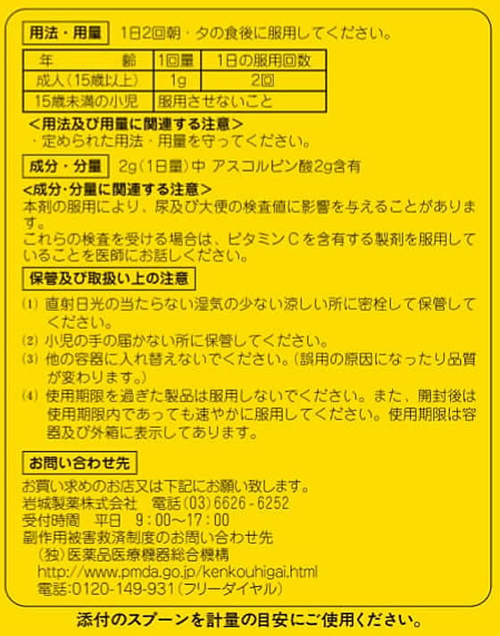 添付のスプーンすりきり1杯が岩城製薬のアスコルビン酸(ビタミンC原末)約1g(約1000mg)です。