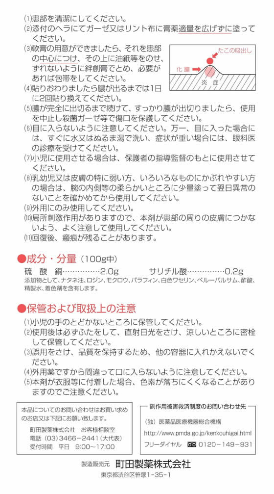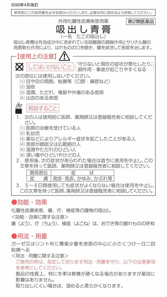 吸出し青膏は有効成分中に含まれている硫酸銅の腐蝕作用とサリチル酸の角質軟化作用により、はれものの口を開き、膿を排泄して患部を治します。