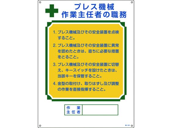 ●型番:049505 ●表示内容:プレス機械作業主任者の職務 ●取付仕様:穴4ヵ所 ●縦(mm):600 ●横(mm):450 ●厚さ(mm):1 ●取付方法:ビスまたはテープ止め(ビス別売、両面テープ6枚付) ●取付穴径:3mm ●表印刷 ●硬質塩化ビニール