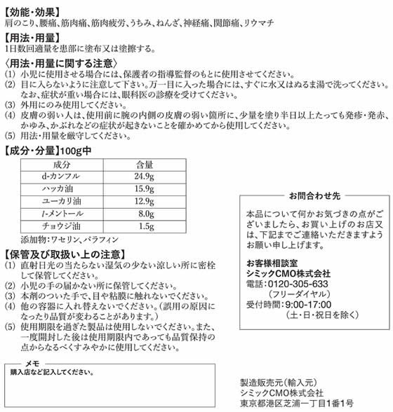 すぐれた浸透性をもった軟膏タイプで、患部にぬると植物由来の生薬成分が皮膚からすみやかに吸収されて、血行を促進し、肩のこり、筋肉の疲れ、痛みに効果をあらわします。また、肩こりや筋肉痛の時は筋肉をもみほぐすことも効果がありますが、タイガーバームをマッサージするようによくすり込みますと、有効成分が浸透し、いっそう効果的です。