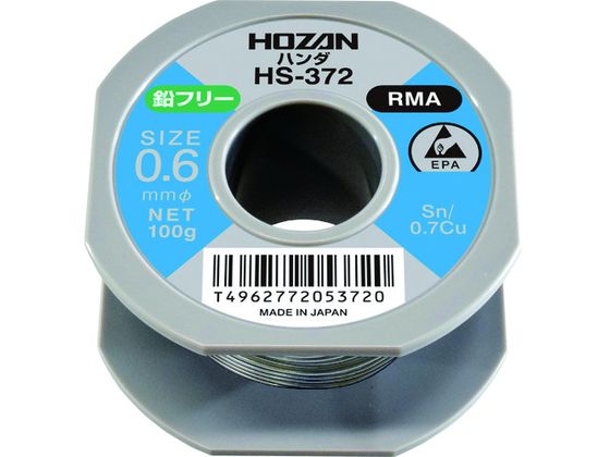 ●型番:HS-372 ●線径(mm):0.6 ●成分(%):Sn99.3/Cu+Ni0.7 ●固相/液相温度(℃):227/227 ●長さ(参考値):48m ●合金組成(すず:99%、銀:0.3%、銅:0.7%)