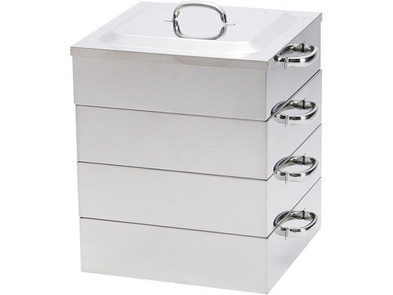 ●鍋:外寸/422×330×高さ125mm、内寸/308×308×高さ115mm、材質/18−8、板厚/0.7mm●蓋:外寸/335×高さ85(取手まで)高さ40(取手なし)mm、材質/18−8、板厚/0.7mm●筒:外寸/422×330×高さ125mm、内寸/308×308×高さ115mm、材質/18−8、板厚/0.7mm●生産地:日本(燕三条)●18−8ステンレス