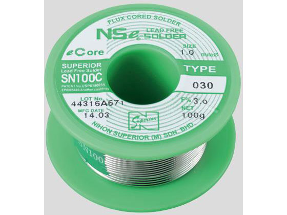 ●合金組成:Sn−0.7Cu−0.05Ni−Ge●融点:227℃●フラックスカテゴリー:ROL0●ハライド系活性剤含有量:0 mass%●巻き重量:100g●線径(φmm):0.8●型番:SN100C(030)F3●生産国:日本