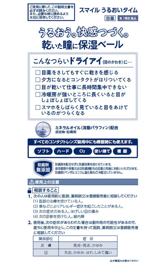 涙液の補助(目のかわき)、ソフトコンタクトレンズ又はハードコンタクトレンズを装着しているときの不快感、目の疲れ、目のかすみ(目やにの多いときなど)