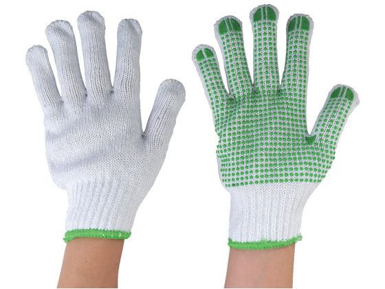 厚手の手袋に緑粒のすべり止加工、一般作業として広く使われています。手袋には綿も含んでおり汗を吸い取ります。 |