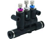 シリンダ速度の二段階調整を実現し、ショックアブソーバと同様の制御が可能になります。シリンダ速度、クッション強弱、クッションの切換タイミングを3個のニードルで調整可能です。大流量タイプは標準品と同じチューブサイズでワンサイズ上の適用シリンダチューブ内径に使用可能です。 |