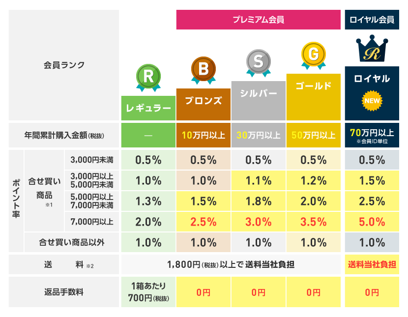 1回のご注文のお買上げ合計金額(税抜)と会員ランクに基づき、ポイント還元率がアップします。