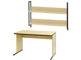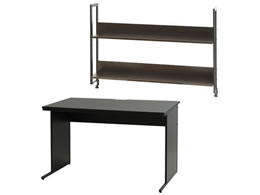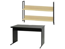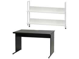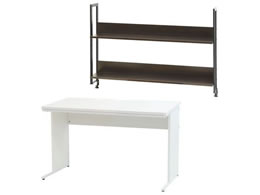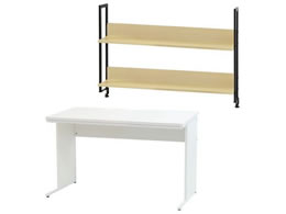 アジャスター付きワークデスクと用途に合わせて使用できる机上ラックの2点セット。